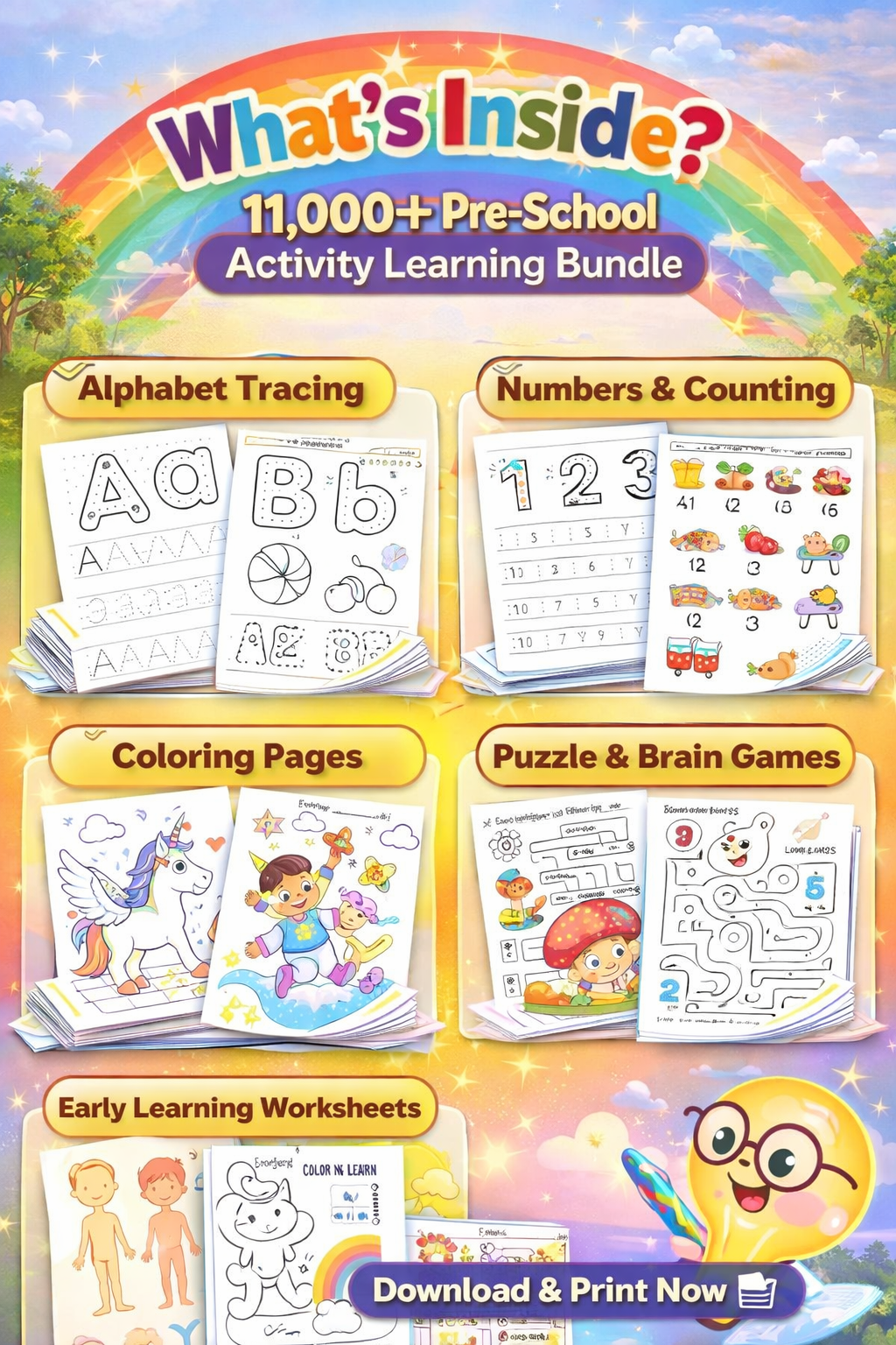 This 11,000+ Pre-School Activity Learning Bundle is packed with educational worksheets designed to make learning enjoyable and interactive for young children.